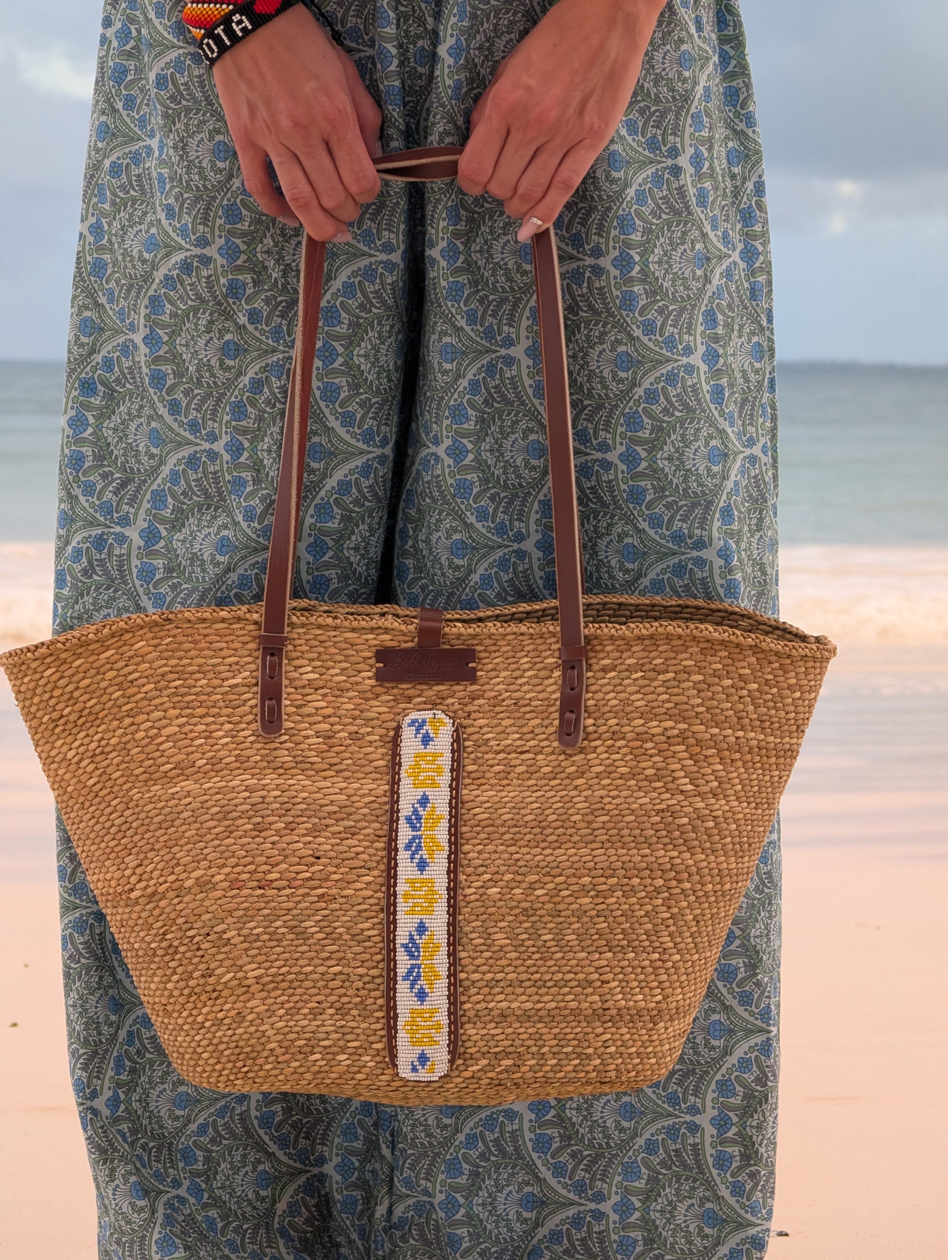 This unique bag is handwoven by skilled artisans in Africa using natural milulu grass — a durable and flexible plant native to East Africa. Featuring a traditional weave and an intricate hand-beaded design in vibrant colors, each piece is a one-of-a-kind expression of cultural heritage.