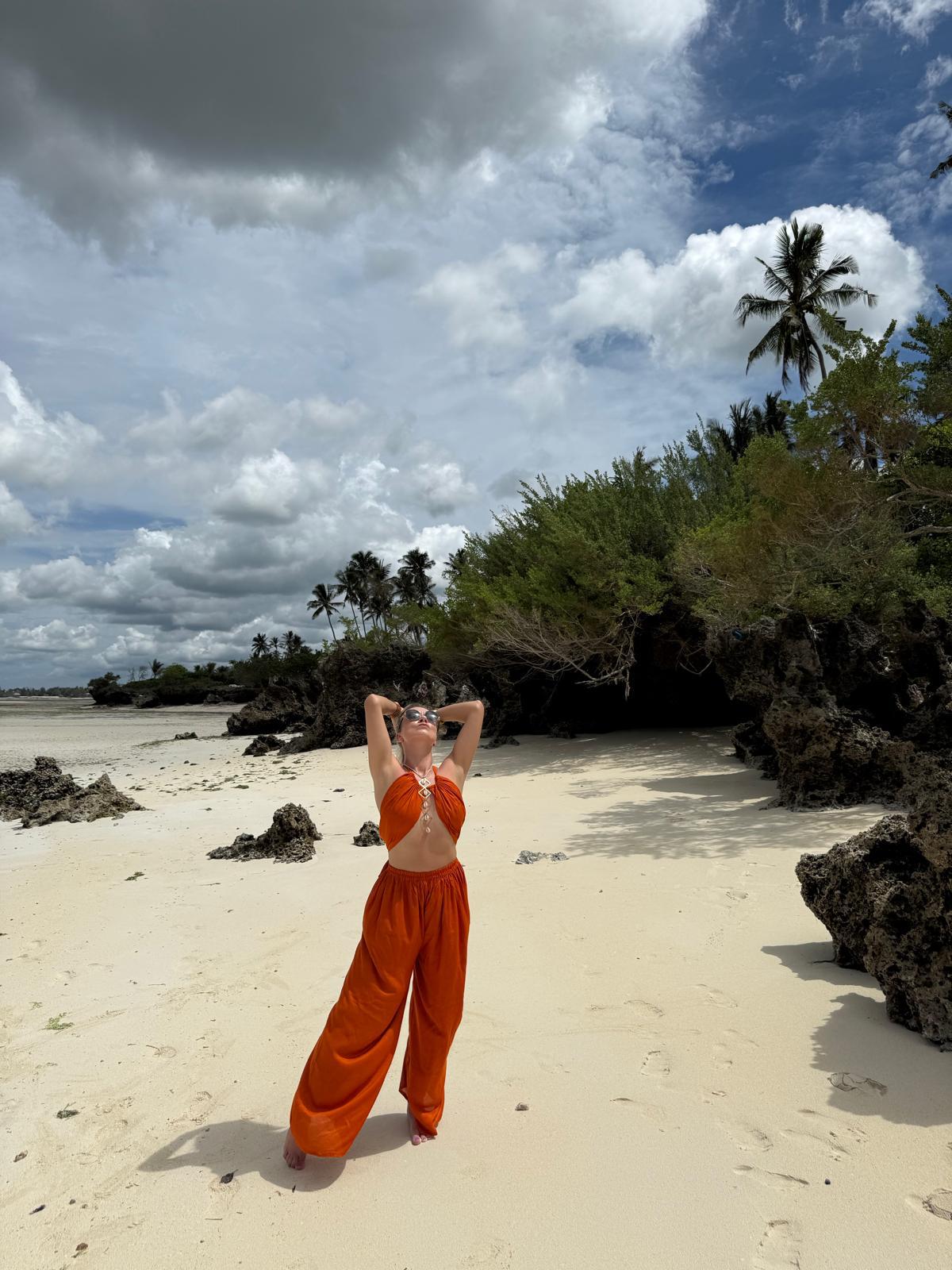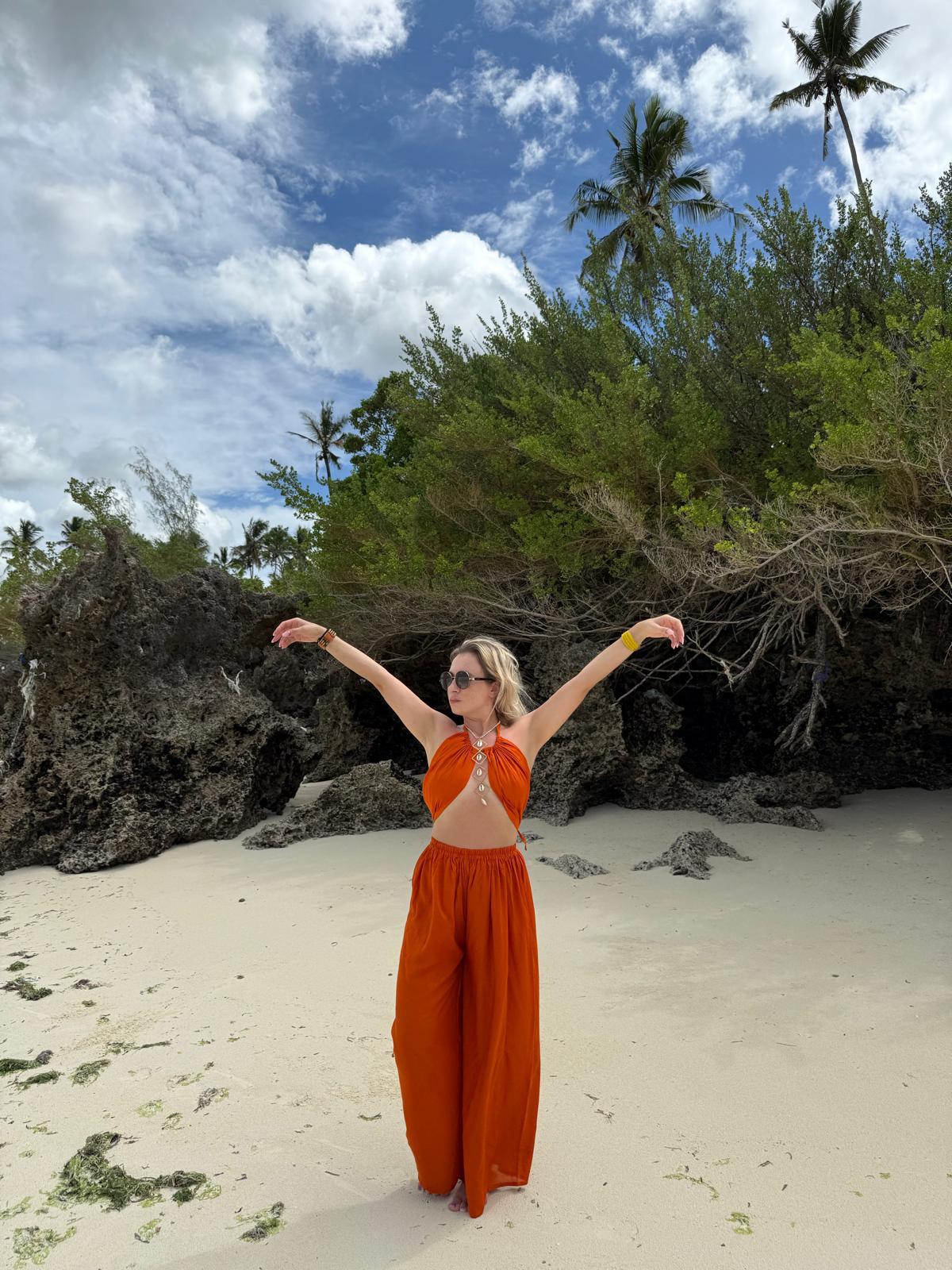 Pants: High-waisted with a stretchy waistband and wide-leg silhouette that flows with every movement for a relaxed yet chic look.